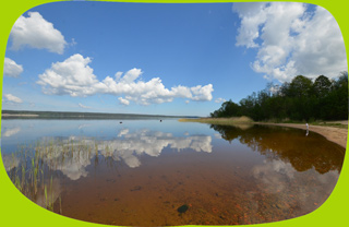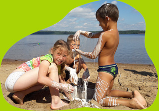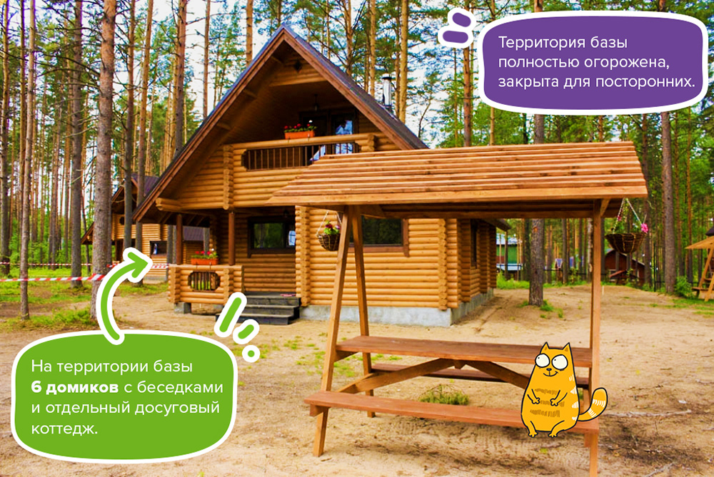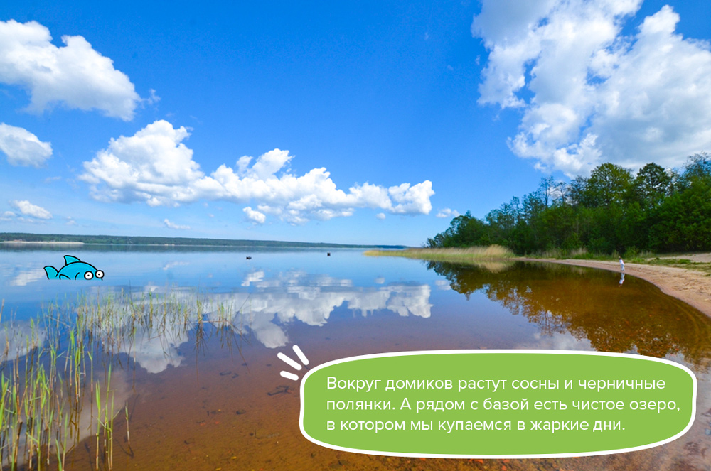 Вокруг домиков растут сосны и черничные полянки. А рядом с базой есть чистое озеро, в котором мы купаемся в жаркие дни.