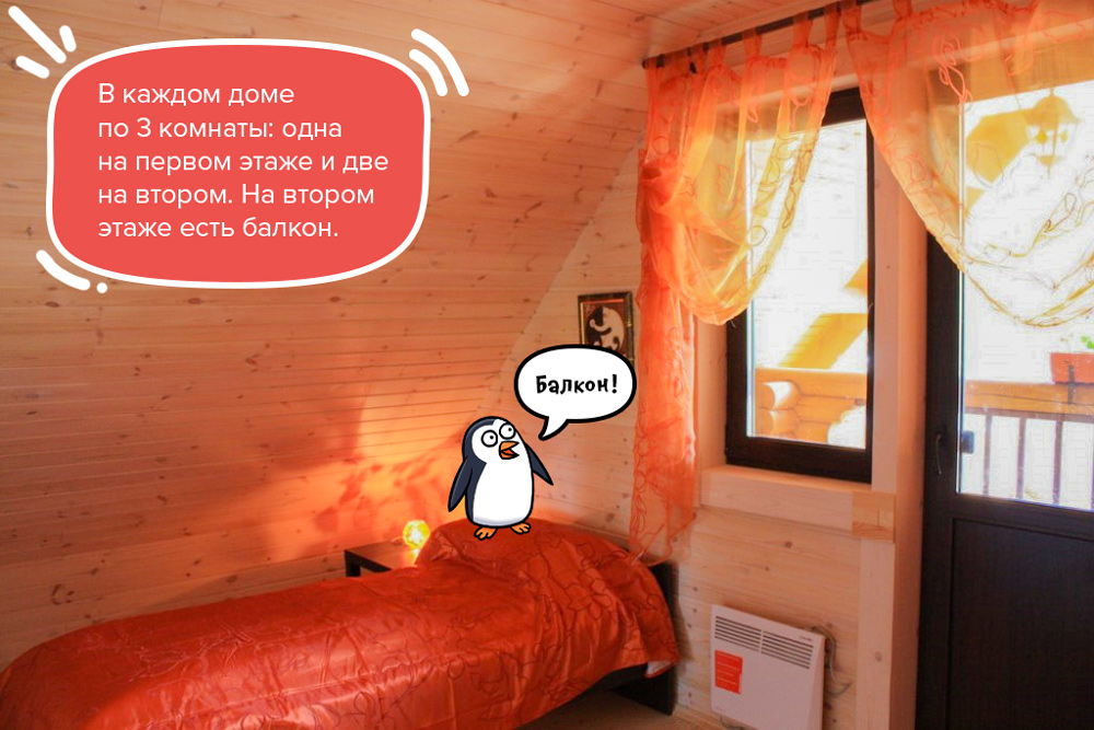 В каждом доме по 3 комнаты: одна на первом этаже и две на втором. На втором этаже есть балкон.