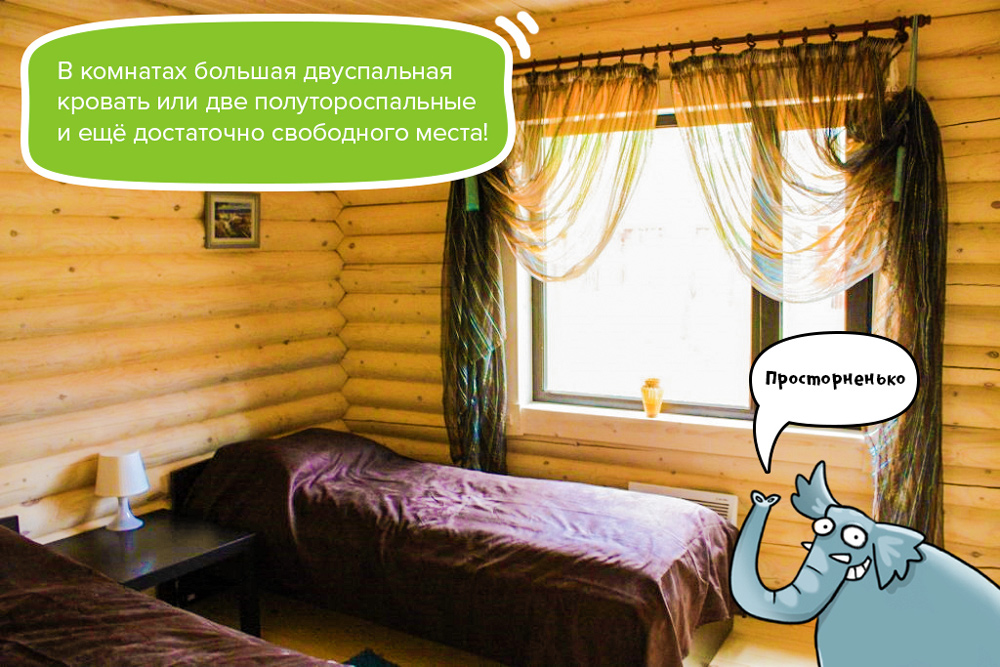 В комнатах большая двуспальная кровать или две полутороспальные и ещё достаточно свободного места.