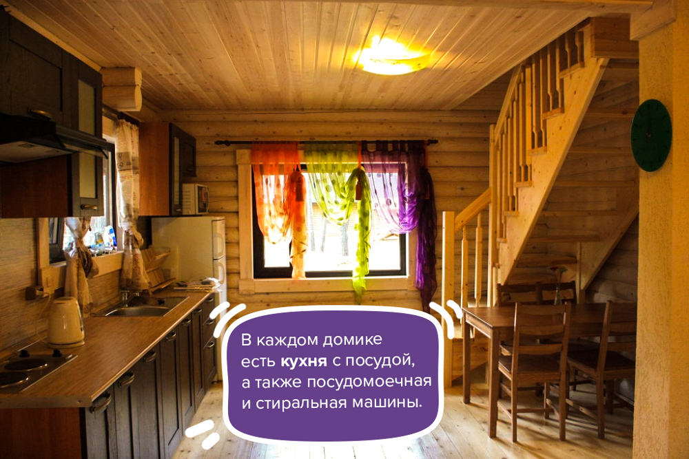 В каждом домике есть кухня с посудой, а также посудомоечная и стиральная машины.
