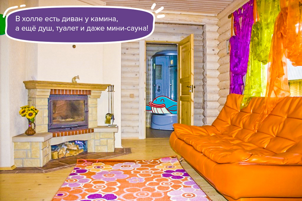 В холле есть диван у камина, а ещё душ, туалет и даже мини-сауна!