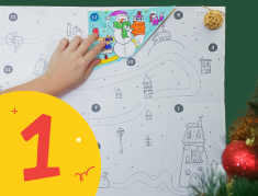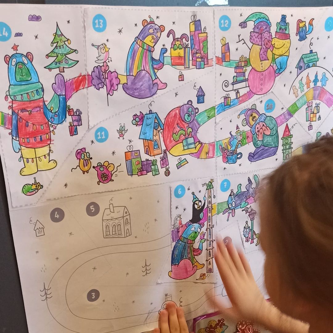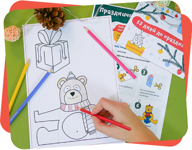 Начнём Адвент с большой новогодней карты, по которой мы будем путешествовать вместе с Медведем: поможем ему делать добрые дела и творить маленькие чудеса. Карта — это ещё и огромная раскраска формата А2, которую в конце Адвента можно превратить в игру-ходилку.