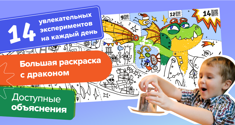 Откройте мир науки для вашего ребёнка с уникальным адвент-календарём «Две недели экспериментов». В нём собраны сразу три вау-элемента: гигантская интерактивная раскраска, 14 экспериментов, доступных по QR-коду, и трекер дней до Нового года. Начало адвента — 18 декабря