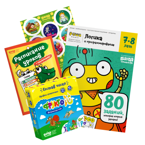 В подарочный набор входит настольная игра Фрукто 10, тетрадь, набор наклеек и расписание