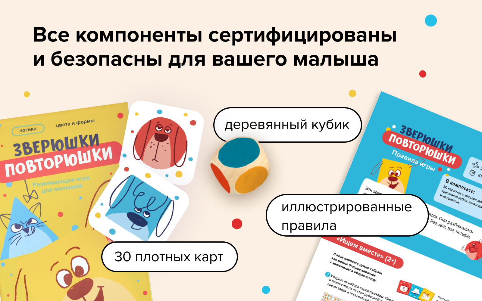 В игре нет одинаковых карт. Главная задача — находить пары животных по схожим признакам. Варианты правил адаптированы под разные возраста: от поиска пар до соревновательных заданий, которые добавляют элемент весёлого челленджа. А дополнительные карты-джокеры развивают внимательность и скорость реакции.