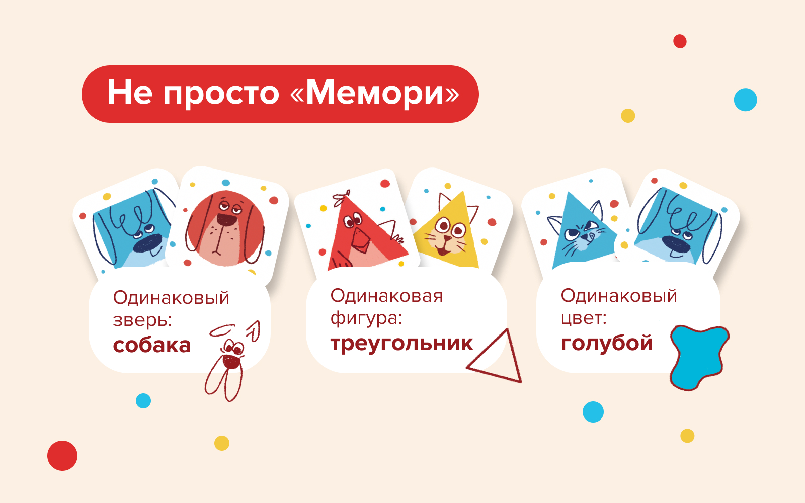 «Зверюшки-Повторюшки» — это уникальный нейротренажёр для детей. Здесь нужно не просто запоминать расположение карточек, а сравнивать разные признаки: цвет, форму и само животное.