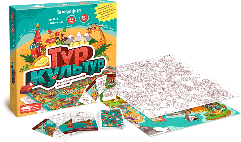 Приготовьтесь к большому путешествию по всему миру: от арктических айсбергов до горячих песков Австралии! В «Тур культур» дети в игровой форме знакомятся с национальными традициями, миром природы, выдающимися историческими личностями, географическими объектами и предметами культуры.